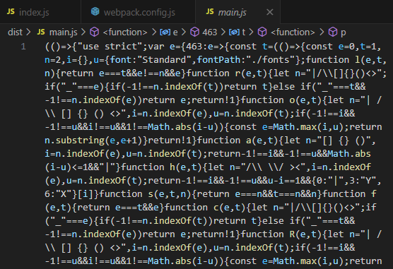output 경로로 가 보면 번들링 결과물을 볼 수 있는데, 보다시피 매우 난해한 코드로 이루어져 있다. 보안적으로 조금의 이점은 가지고 있다고 한다.