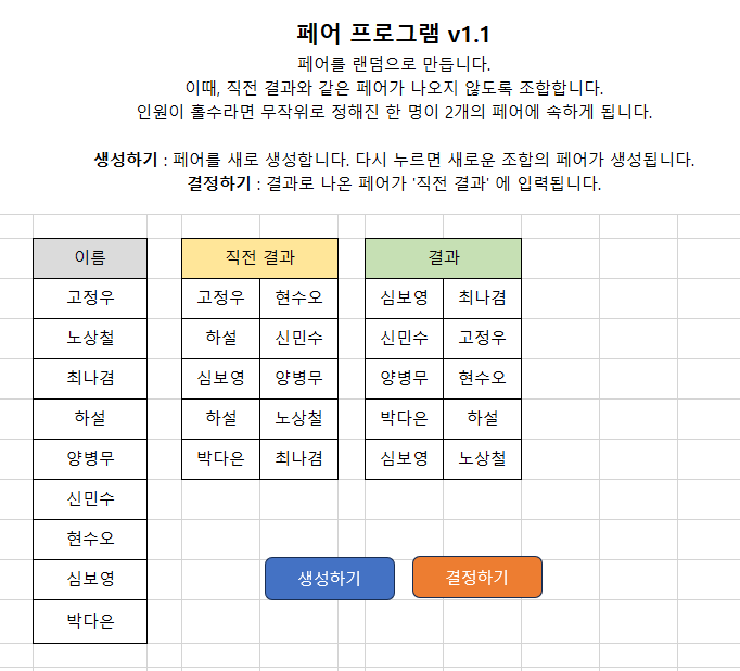 기존 프로그램은 인원이 홀수라면 빈 셀이 하나 생겼으나, 새로운 프로그램에서는 무작위로 정해진 한 명이 2개의 페어에 속하도록 변경했습니다.