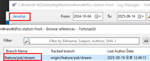 그리고 아래처럼 파란 글씨를 클릭해 가지고 오고 싶은 커밋이 존재하는 하위 브랜치를 선택한다.