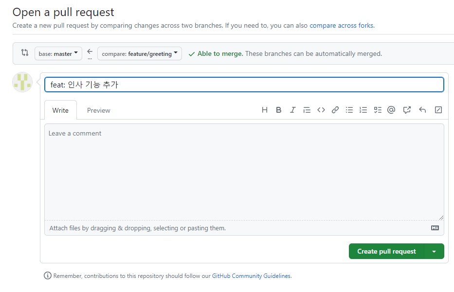 또 message를 쓰라고 하는데, 특이사항이 없다면 commit message와 비슷하게 쓰면 됩니다. 사실 디폴트로 commit message 내용이 알아서 들어갑니다.