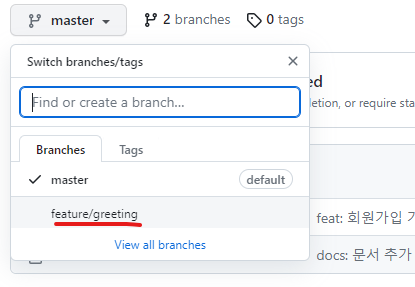 현재 branch가 master에서 feature/greeting으로 변경되었습니다.