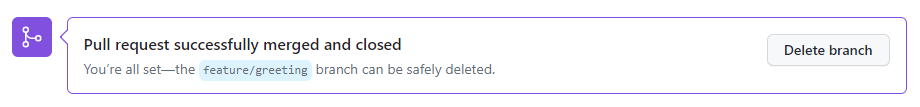 merge 성공 후엔 저런 메시지가 뜨는데, 보통 merge 후엔 branch가 필요없으므로 웬만하면 Delete branch를 눌러줍니다. 여러 개 생기면 지저분하고 헷갈리기 때문이죠.