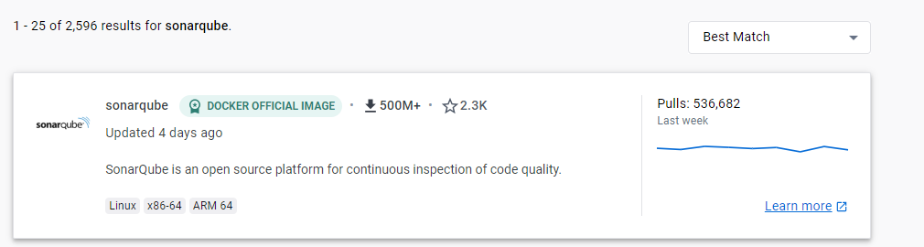 도커 공식 이미지인 소나큐브의 이미지가 맨 위에 뜹니다. 공식 이미지인만큼 신뢰성 있고 사람들이 많이 사용하는 이미지입니다.