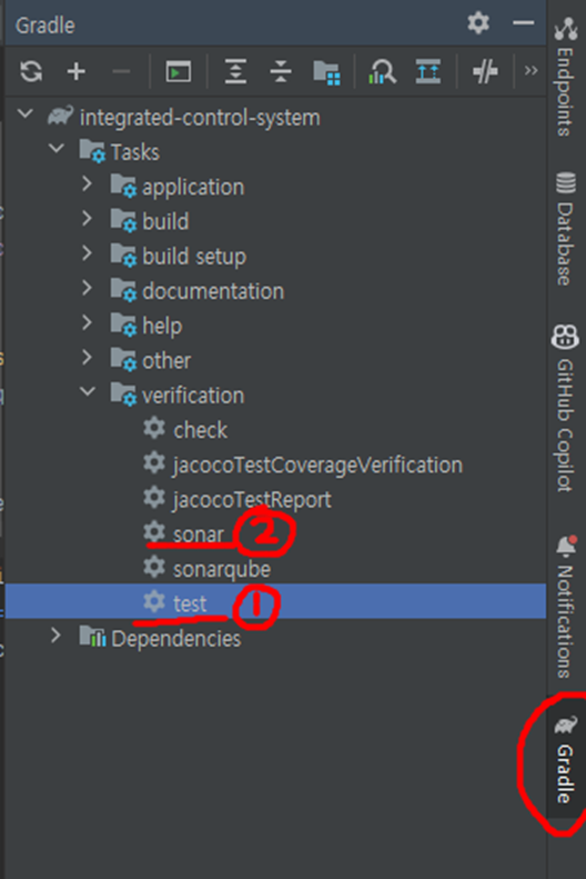 (2) Gradle Tasks를 1, 2순으로 클릭하여 명령어 실행