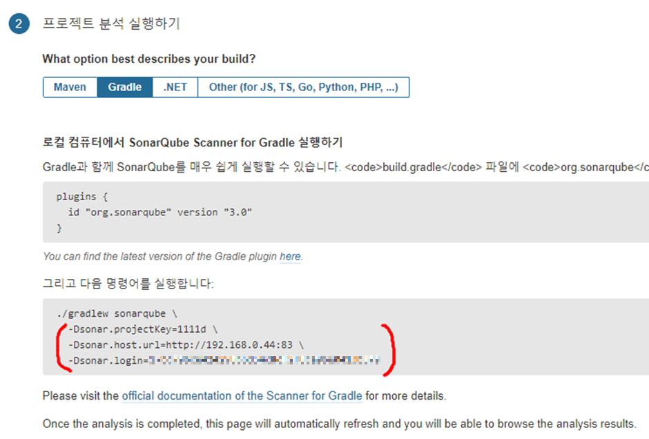 "sonar.login": "생성되었던 토큰 입력"